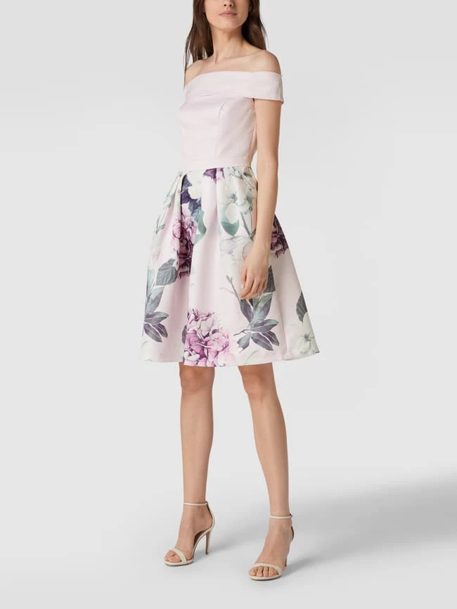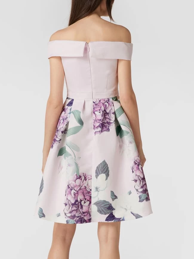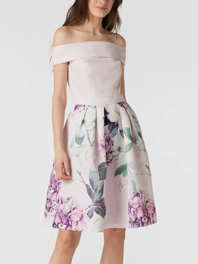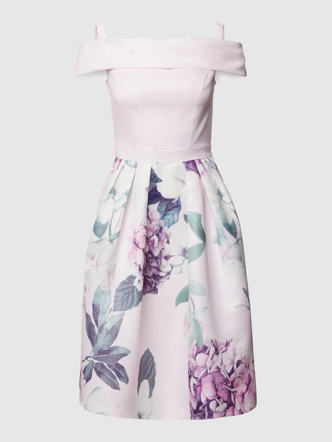 Das Cocktailkleid von Chi Chi London ist aus strapazierfähigem Material gefertigt und tailliert geschnitten. Es kommt im Off-Shoulder-Look mit floralem Muster, Ziernähten und Nahtreißverschluss auf der Rückseite.