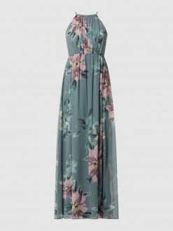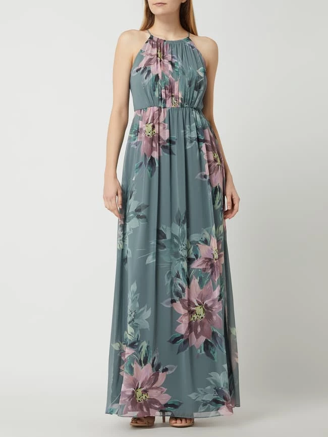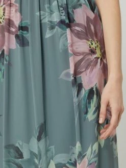 Das Abendkleid von Jake*s Cocktail ist aus Chiffon gefertigt und tailliert geschnitten. Es zeigt sich mit floralem Muster, schmalen Trägern und gelegten Falten.