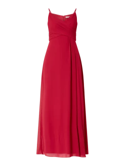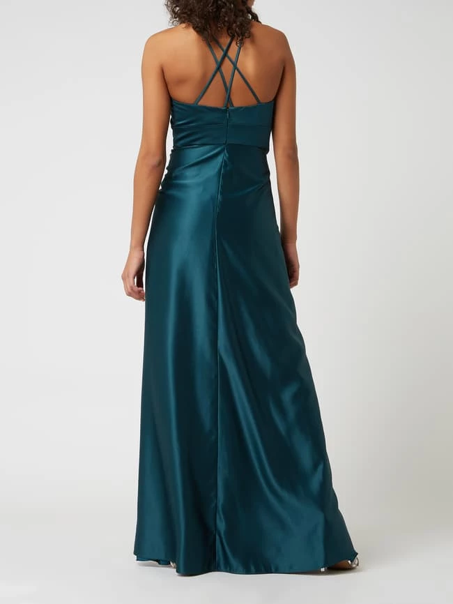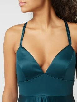 Das Abendkleid von Jake*s Cocktail ist aus Satin gefertigt. Es zeigt sich in taillierter Passform mit tiefem Ausschnitt und gekreuzten Spaghettiträgern.