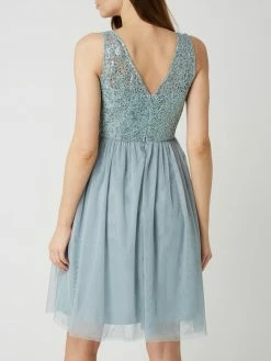 Das Cocktailkleid von Jake*s Cocktail ist aus Mesh gefertigt. Es zeigt sich in taillierter Passform mit floralen Zierborten, Pailletten und tiefem Rückenausschnitt.