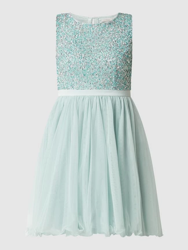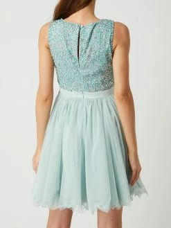 Das Cocktailkleid von Jake*s Cocktail ist aus Tüll gefertigt und tailliert geschnitten. Es zeigt sich mit Strasssteinen, Pailletten und mehrlagigem Rockteil.