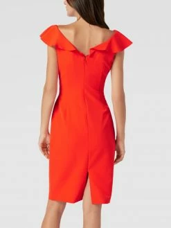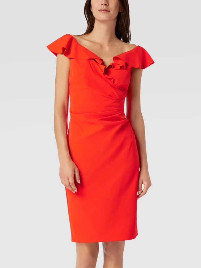 Das Cocktailkleid von Lauren Ralph Lauren ist aus einem Material-Mix mit Elasthan-Anteil gefertigt und körpernah geschnitten. Es zeigt sich in Wickel-Optik mit Volants.