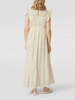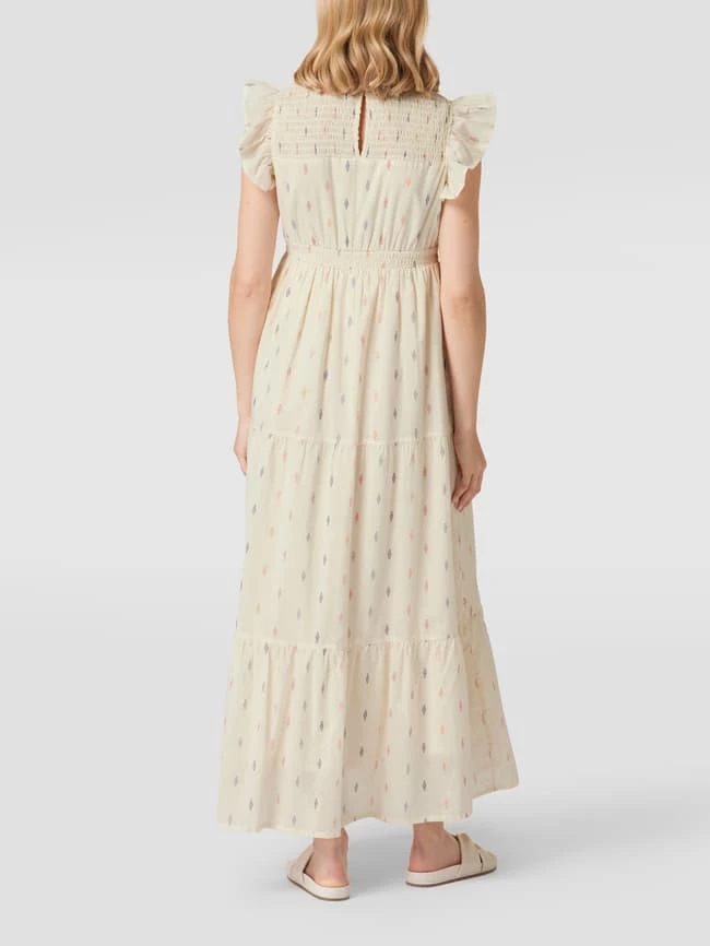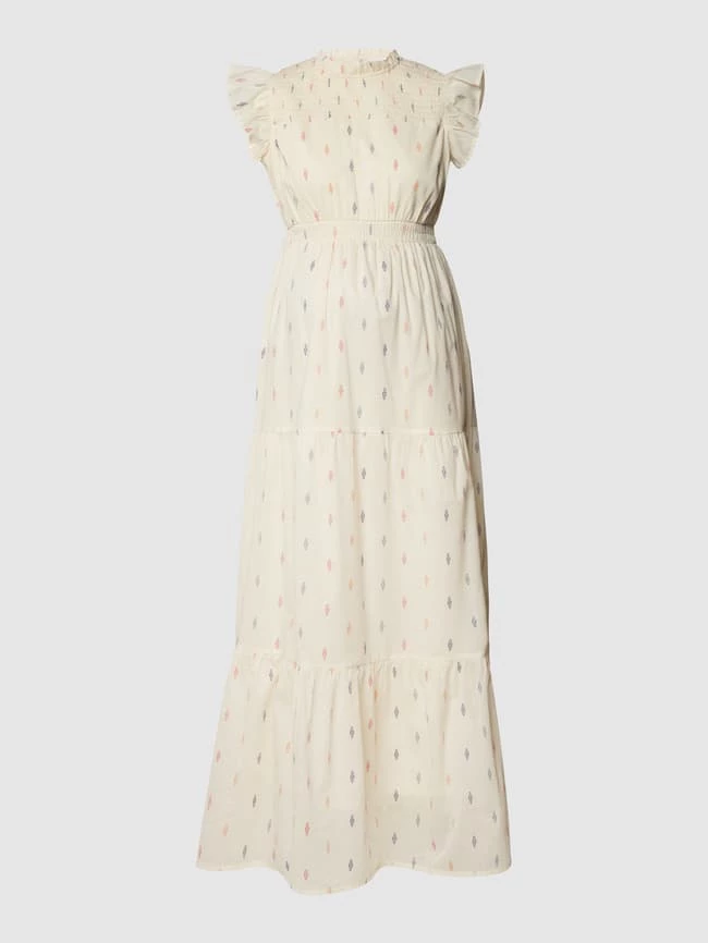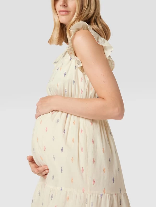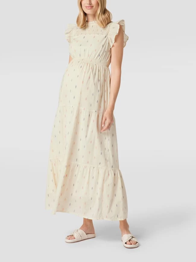 Das Umstands-Kleid von Mamalicious ist aus reiner Baumwolle gefertigt und locker geschnitten. Es kommt im Stufen-Look mit Allover-Muster, Smok-Details, Rundhalsausschnitt, Volantärmel und elastischem Einsatz.