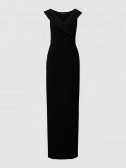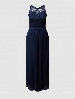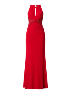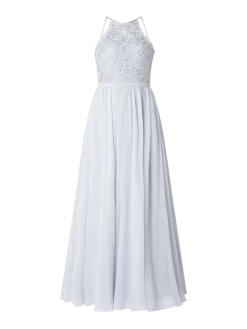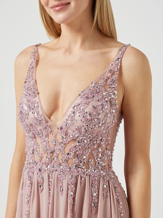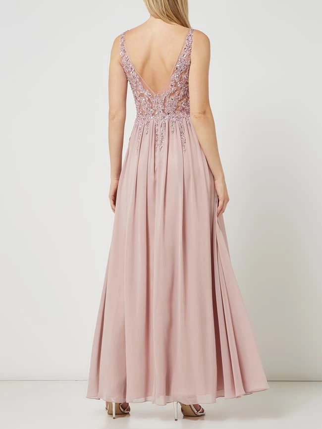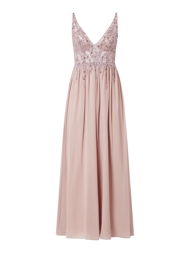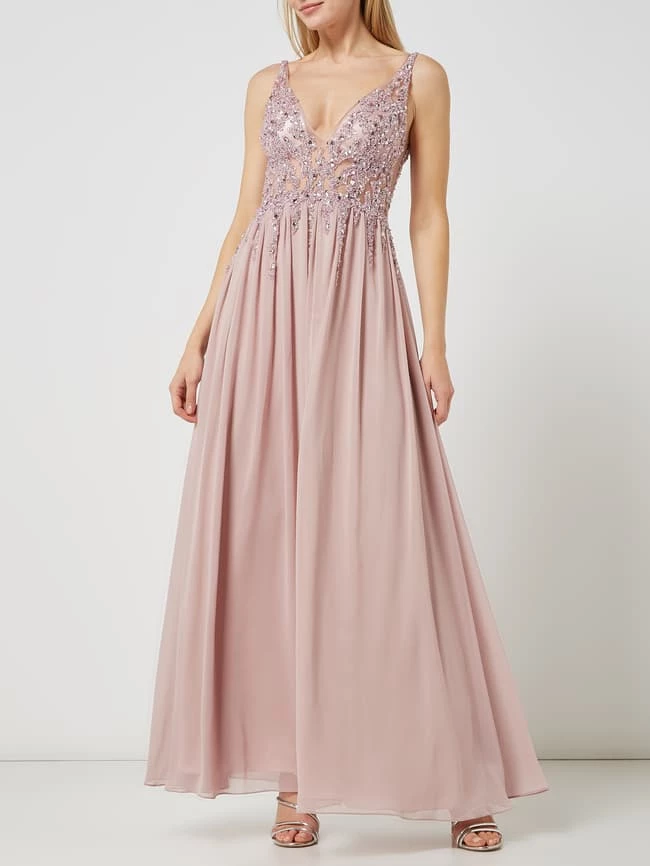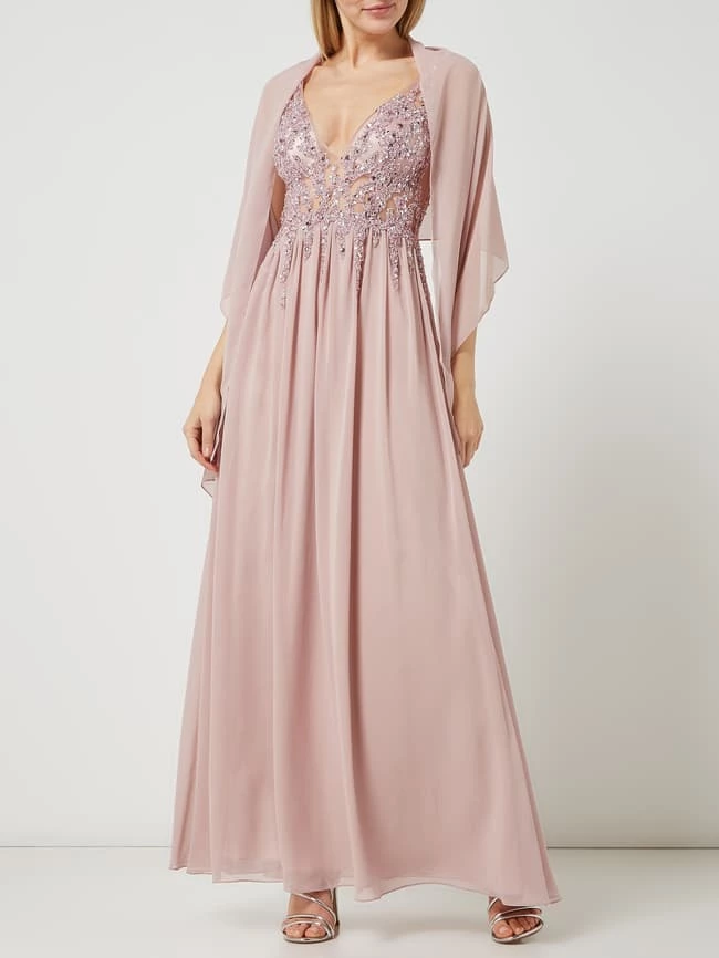 Das Abendkleid von Mascara ist aus Organza und Chiffon gefertigt. Es zeigt sich in taillierter Passform mit wattierten Cups, Ziersteinen und Pailletten.