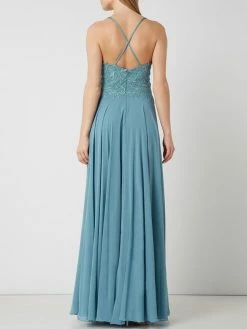 Das Abendkleid von Mascara ist aus Mesh und Chiffon gefertigt. Es kommt in taillierter Passform mit floralen Stickereien, Pailletten und ausgestelltem Rockteil.