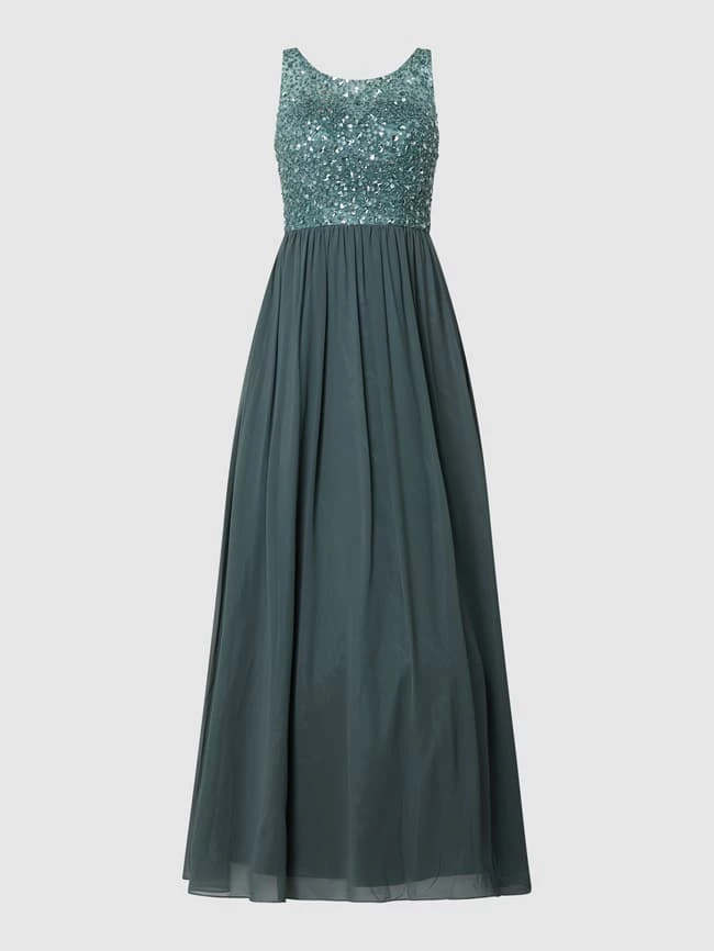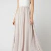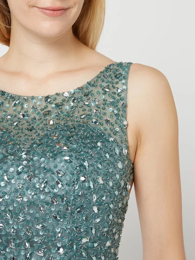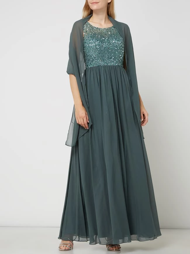 Das Abendkleid von Mascara ist aus Tüll und Chiffon gefertigt. Es zeigt sich in taillierter Passform mit Ziersteinen, Pailletten und feinen Raffungen.