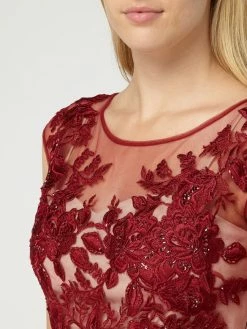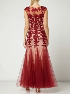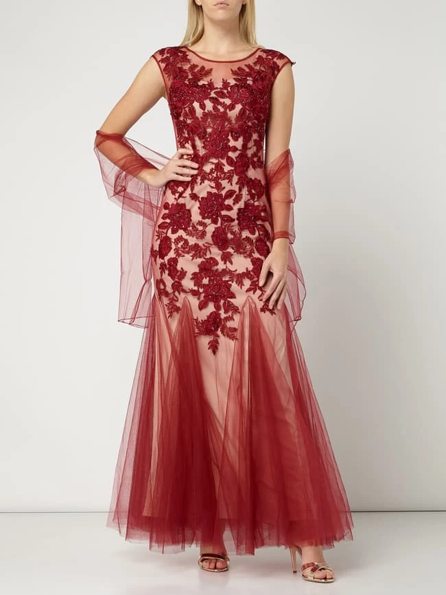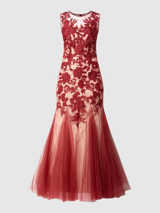 Das Brautkleid von Mascara ist aus strapazierfähigem Material gefertigt und im Meerjungfrau-Stil gehalten. Es kommt mit floralen Stickereien, Herzausschnitt und breiten Trägern sowie semitransparentem Obermaterial.