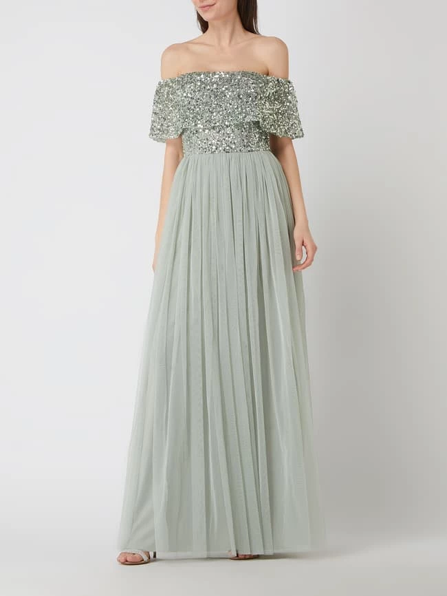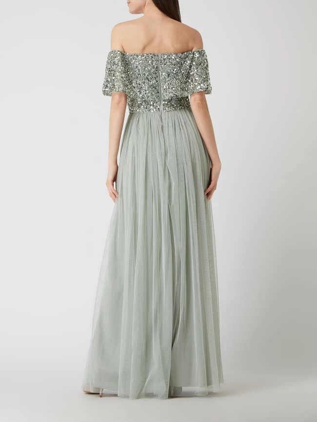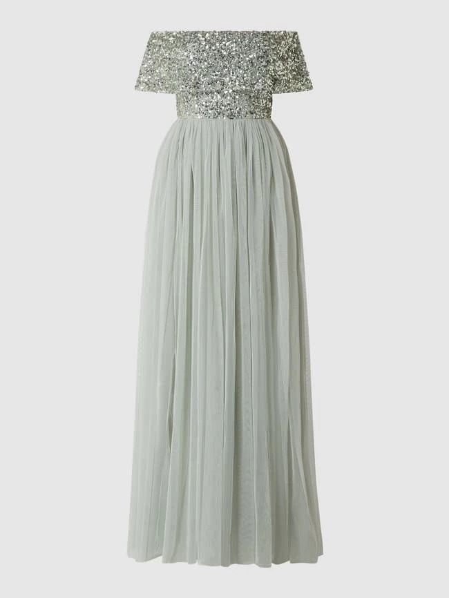 Das Abendkleid von Maya Deluxe ist aus Mesh gefertigt und tailliert geschnitten. Es kommt im Off-Shoulder-Look mit Pailletten am Oberteil, ausgestelltem Rockteil und feinen Raffungen.
