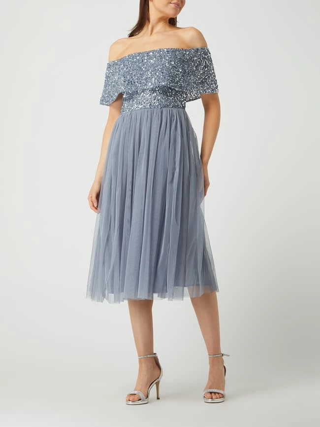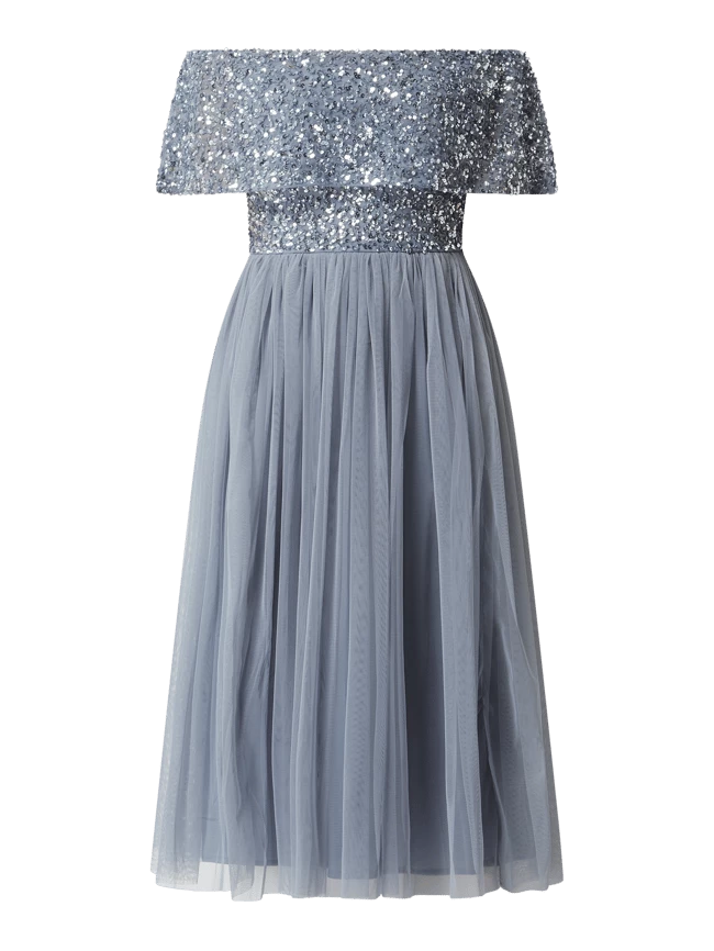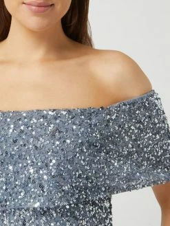 Das Cocktailkleid von Maya Deluxe ist aus Mesh und Chiffon gefertigt. Es kommt im Off-Shoulder-Look mit Pailletten, Carmen-Ausschnitt und ausgestelltem Rockteil.