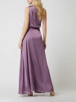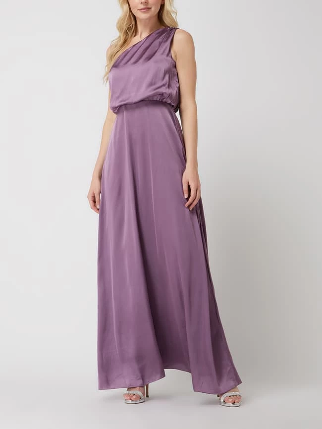 Das Abendkleid von Maya Deluxe ist aus Satin gefertigt und tailliert geschnitten. Es zeigt sich im One-Shoulder-Look mit asymmetrischem Ausschnitt und gelegten Falten.