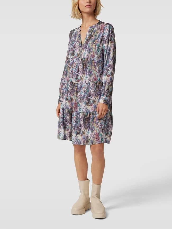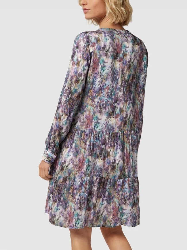 Das knielange Kleid von MILANO ITALY ist aus reiner Viskose gefertigt und locker geschnitten. Es zeigt sich im Stufen-Look mit Allover-Muster und V-Ausschnitt.