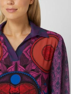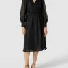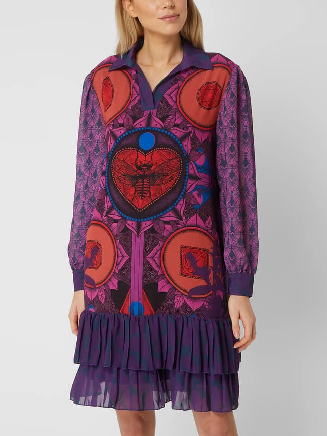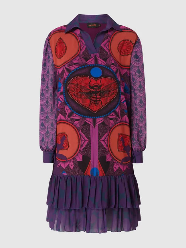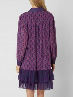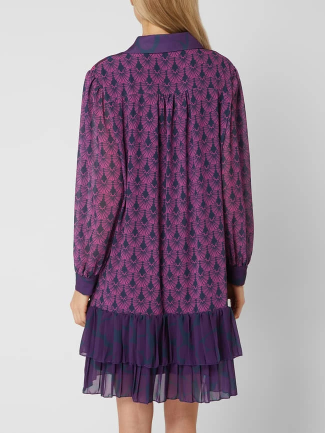 Das Kleid von miss goodlife ist aus Chiffon gefertigt und ausgestellt geschnitten. Es zeigt sich mit Ornament-Muster, Umlegekragen und Volantsaum mit Plisseefalten.