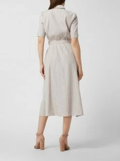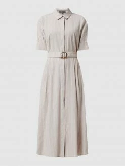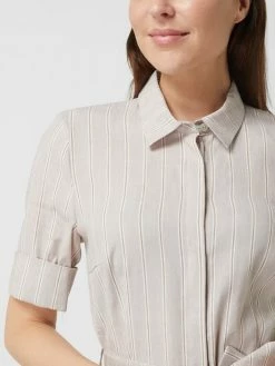 Das Blusenkleid von MONTEGO ist aus einer Leinenmischung mit Viskose- und Stretch-Anteil gefertigt. Es zeigt sich in taillierter Passform mit Streifenmuster, verdeckter Knopfleiste und Gürtel.