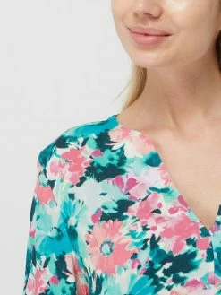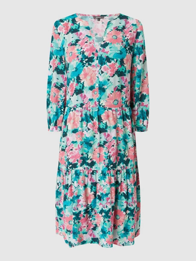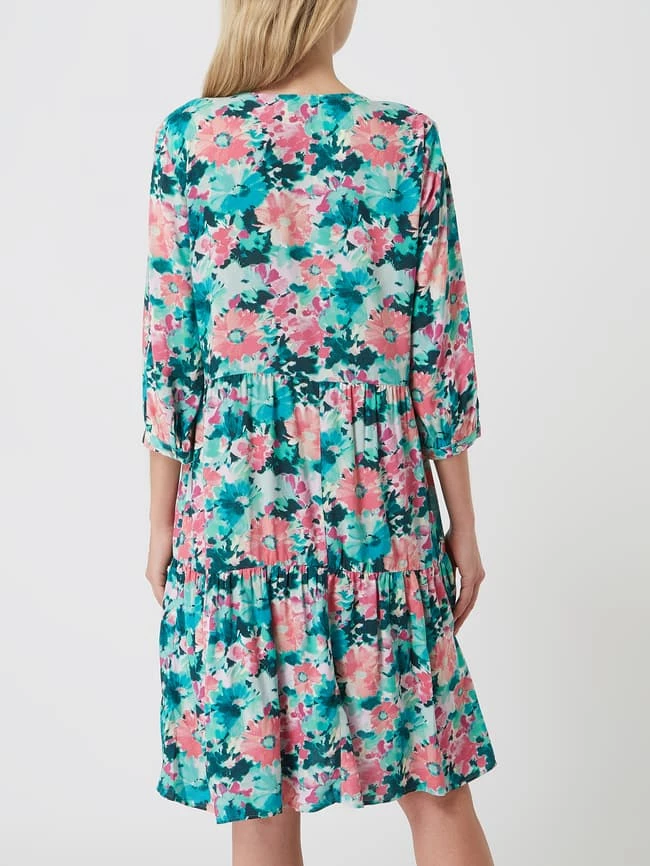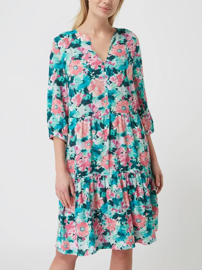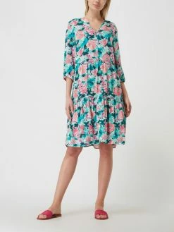 Das Kleid von MONTEGO ist aus reiner Viskose gefertigt und leicht ausgestellt geschnitten. Es zeigt sich mit Allover-Muster, Tunikakragen und Volantsaum.