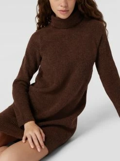 Das Minikleid von PIECES ist aus einem Material-Mix mit Woll-Anteil gefertigt und gerade geschnitten. Es zeigt sich in Strick-Optik mit Rollkragen und gerippten Abschlüssen.