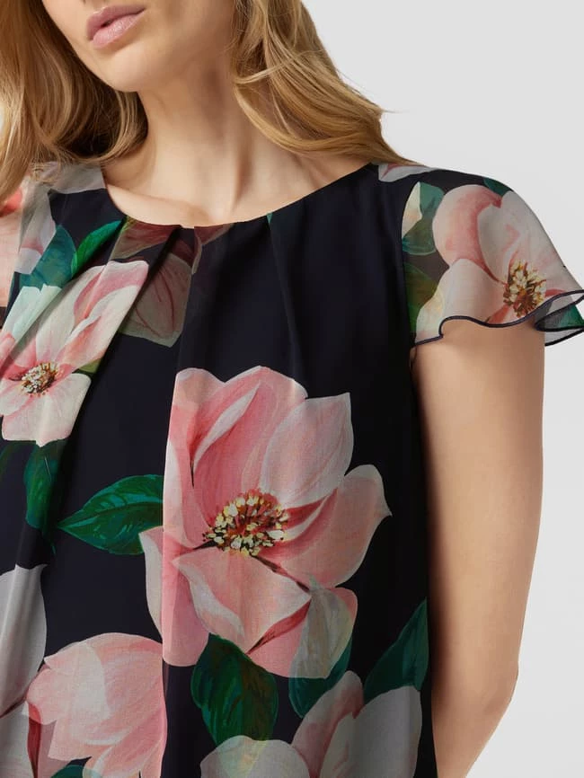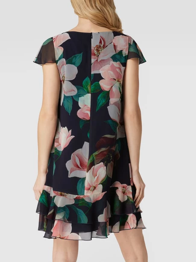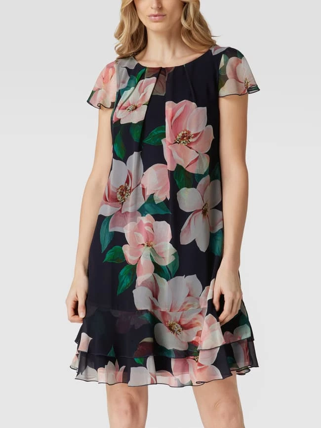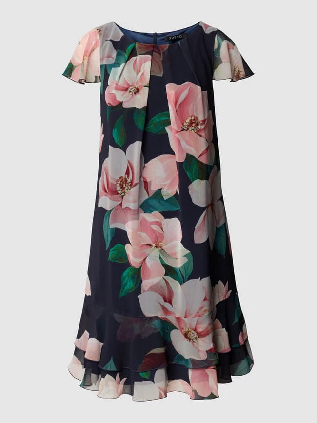Das Cocktailkleid von SWING ist aus strapazierfähigem Material gefertigt und locker geschnitten. Es kommt mit floralem Muster, gelegten Falten, Rundhalsausschnitt und Volantärmeln.