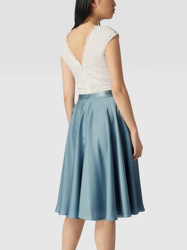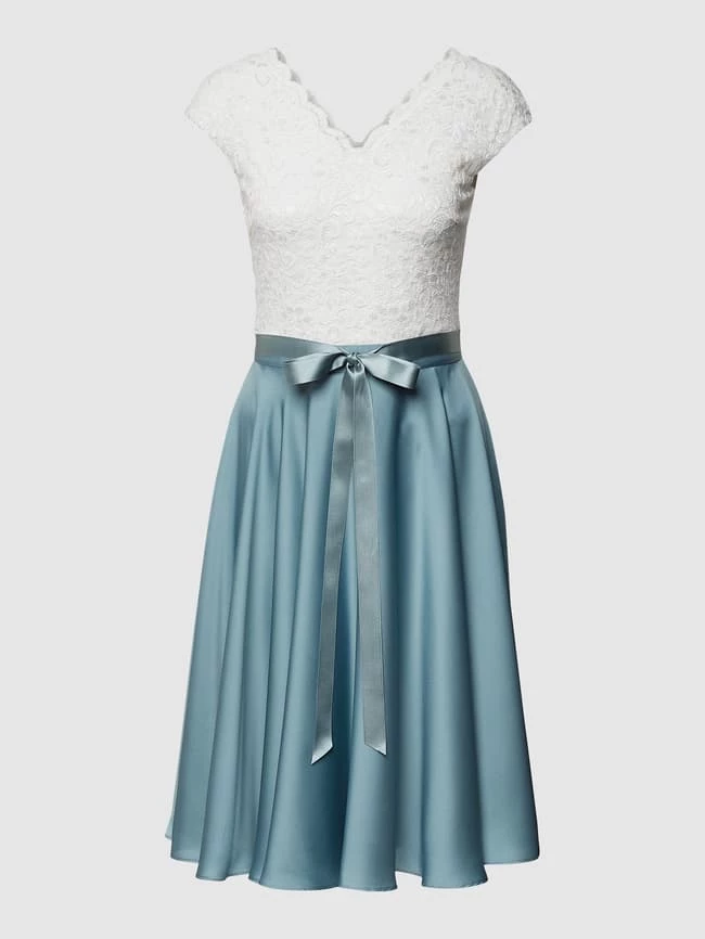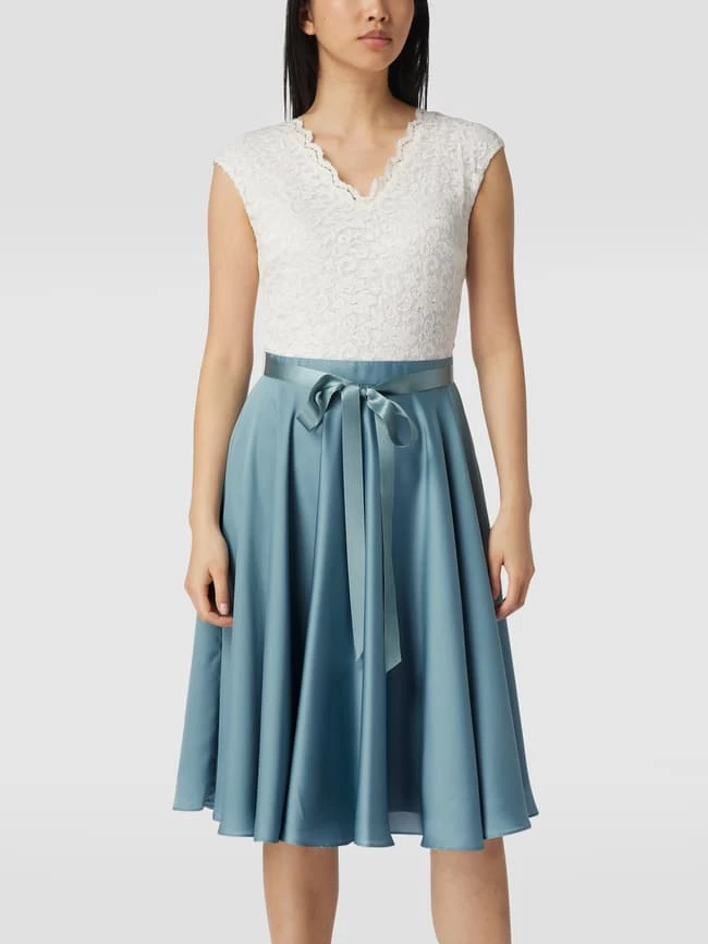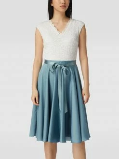 Das Cocktailkleid von SWING ist aus strapazierfähigem Material gefertigt und tailliert geschnitten. Es kommt mit V-Ausschnitt, gelegten Falten und Taillenband sowie Oberteil aus Stickereien.