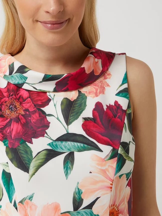 Das Cocktailkleid von Vera Mont ist aus einer Materialmischung mit Stretch-Anteil gefertigt und tailliert geschnitten. Es kommt mit floralem Muster, umgelegtem Kragen und ausgestelltem Rockteil.