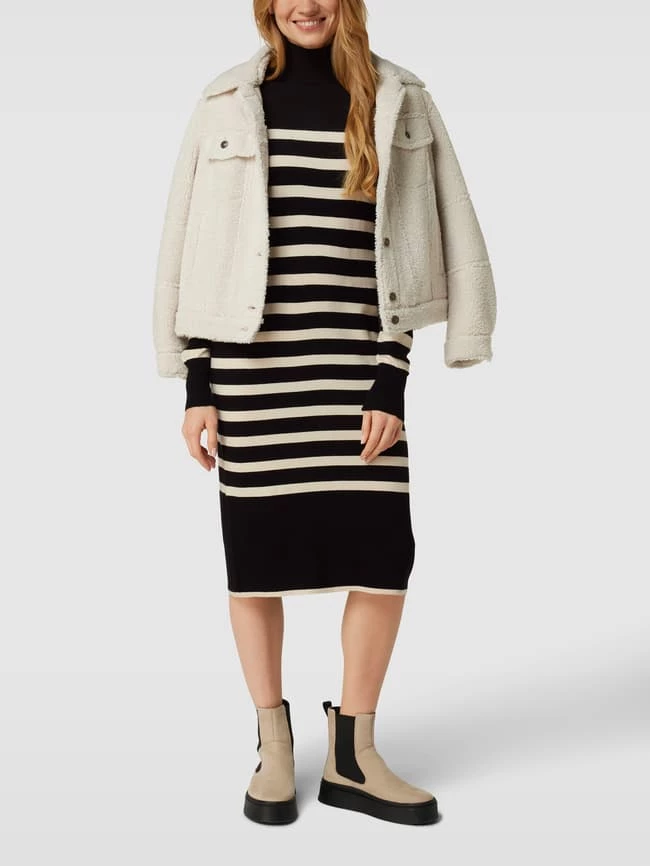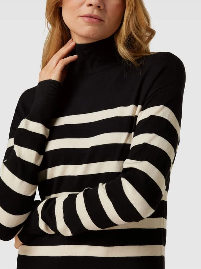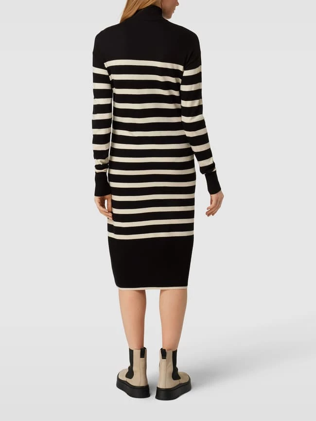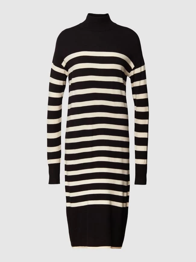 Das Strickkleid von VERO MODA ist aus einem Viskose-Mix gefertigt und gerade geschnitten. Es kommt mit Stehkragen, Streifenmuster und überschnittenen Schultern.